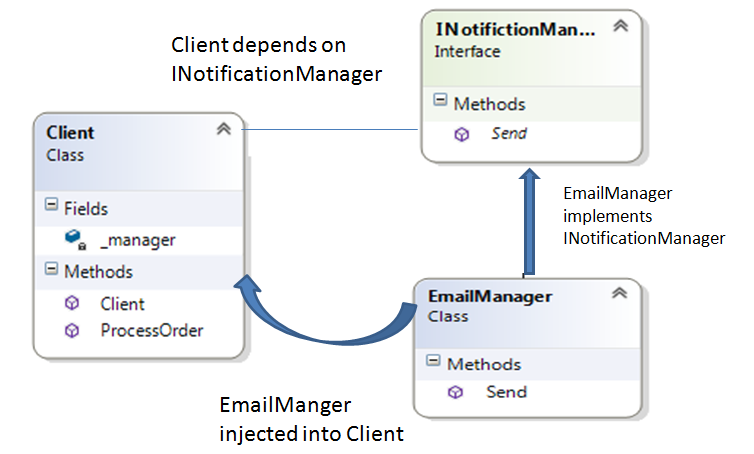If you look carefully the Client class is not creating an instance of type INotifictionManager, instead of someone while instantiating Client is passing an instance of INotifictionManager type. So Client dependency on notification in being injected into it via INotifictionManager type. THIS IS CALLED DEPENDENCY INJECTION.